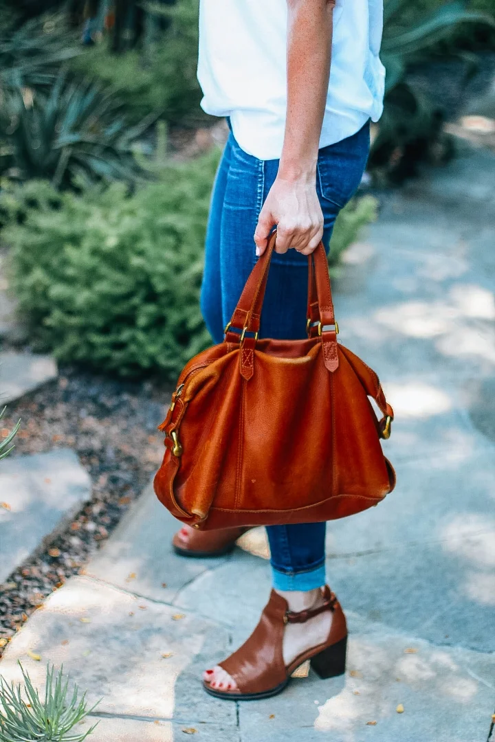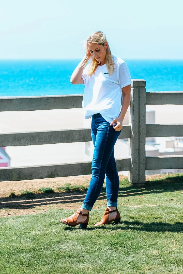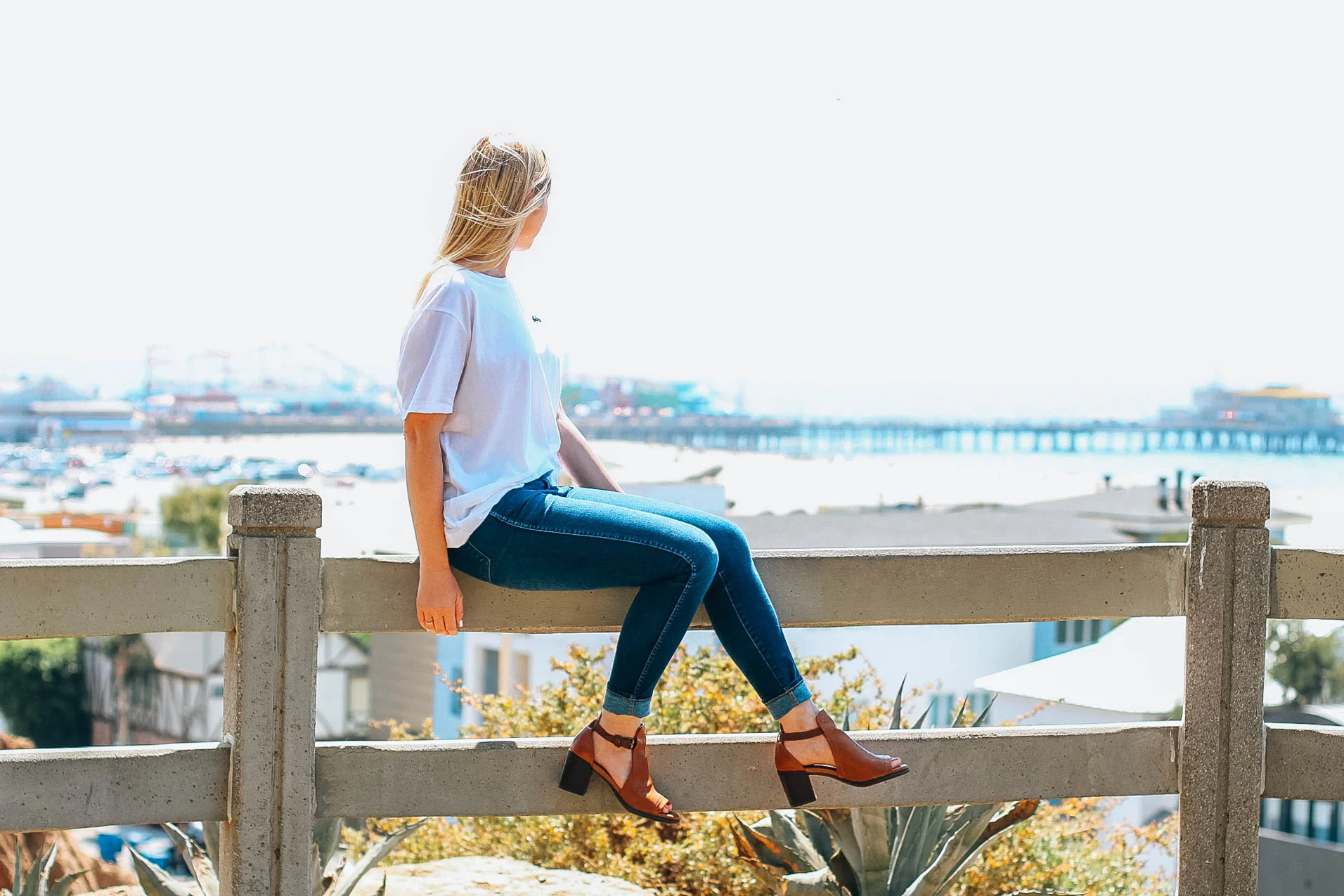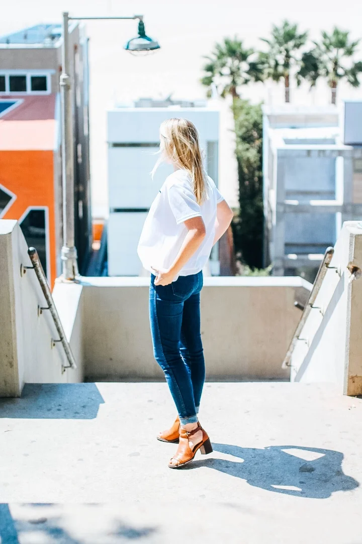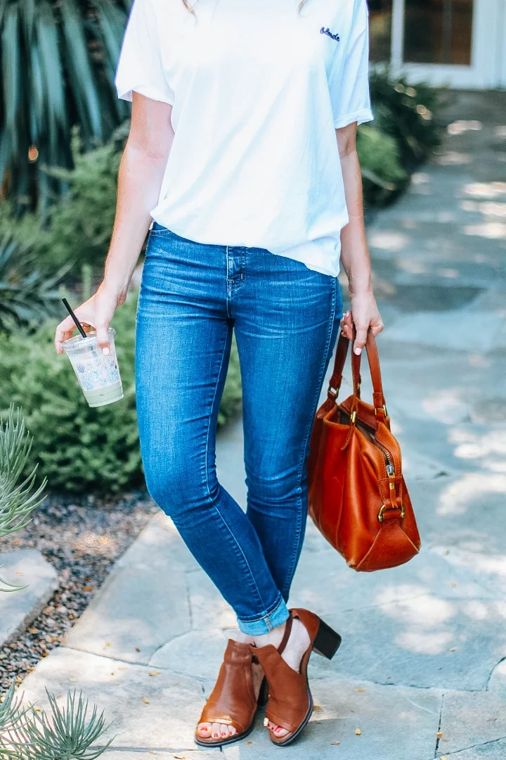 Since that cold crisp air won’t hit us Californians until December, I can usually get away with showing a little more skin this time of year. My OTBT open toe ankle booties are the perfect pair of shoes when I want to dress for PSL season. I paired the rich medium brown Metaphor Sandals with Madewell Jeans and a Brunette The Label stitched t-shirt. As soon as it starts getting below 70 degrees in LA, you’ll find me wearing these shoes with jeans and a cozy sweater.