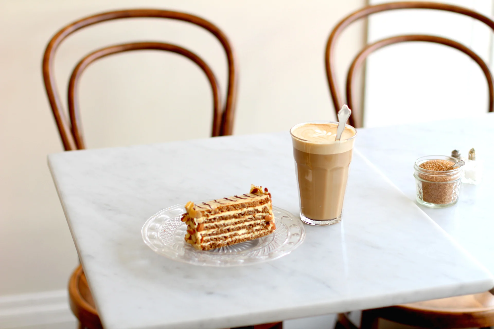 Since I like to eat breakfast as soon as I wake up, the 10am opening time on a Saturday could not come soon enough. Matt and I met my sister and her boyfriend at 9:58am, waiting patiently for the doors to open. After a quick look at the menu we made our selection and took a seat. I, also, snagged a layered almond cake to sustain our hunger cravings while our open faced bagels were being prepared. Doesn’t it look delicious?! Well-it was! The large latte was also incredible, but the breakfast is my absolute favorite. I had a bite of Matt’s pastrami eggs on a poppy seed bagel and there’s a chance I will switch up my usual favorite for that order next time! What I also love about 20th Century Café is that they constantly switch up the breakfast options- no matter what you can find the bagel and lox, but it makes it a great breakfast spot if you are the kind of person who likes to mix it up.